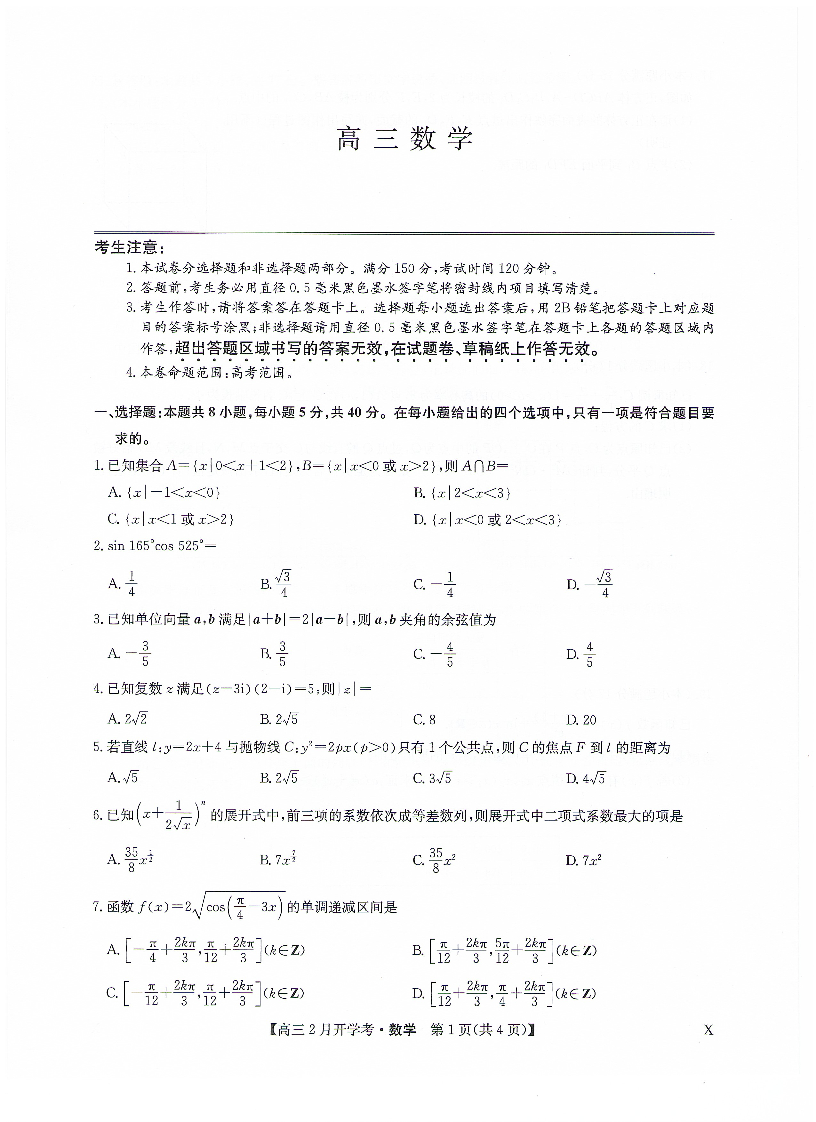 九师联盟2023-2024学年下学期高三2月开学考试 数学