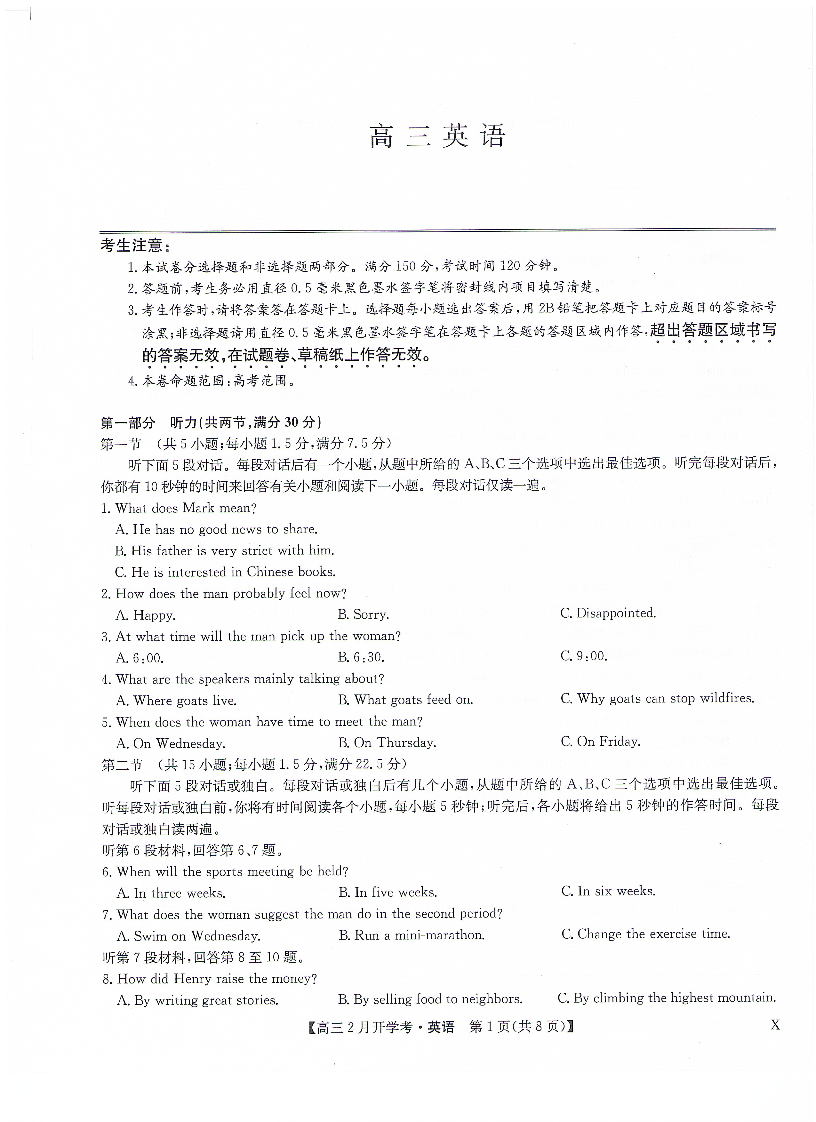 九师联盟2023-2024学年下学期高三2月开学考试 英语