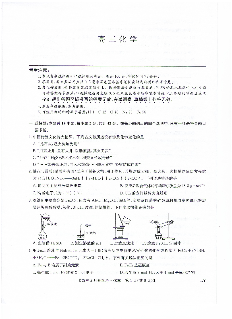 九师联盟2023-2024学年下学期高三2月开学考试 化学