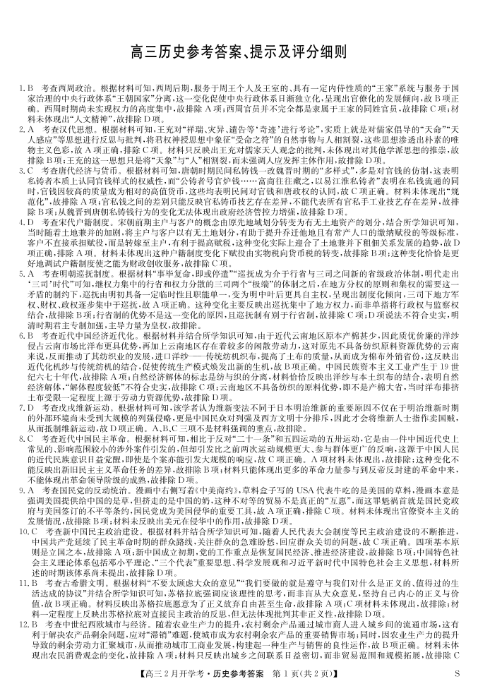 九师联盟2023-2024学年下学期高三2月开学考试 历史答案