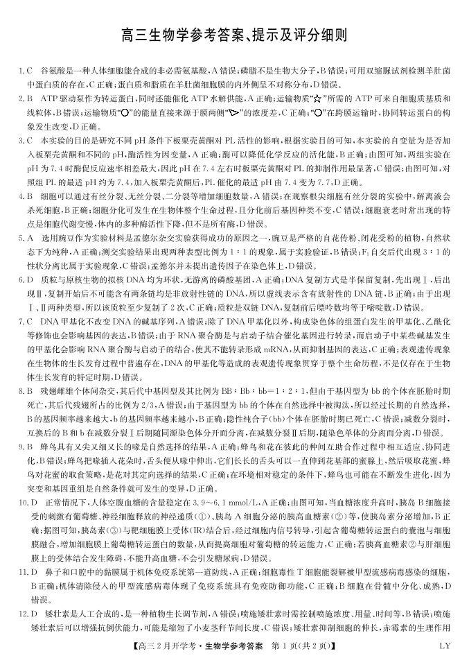 九师联盟2023-2024学年下学期高三2月开学考试 生物答案