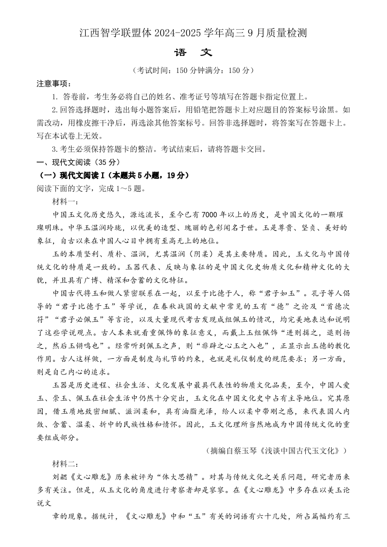 江西智学联盟体2024-2025学年高三9月质量检测+语文
