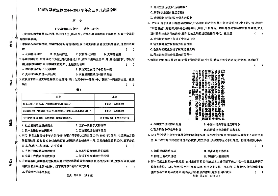 江西智学联盟体2024-2025学年高三9月质量检测+历史