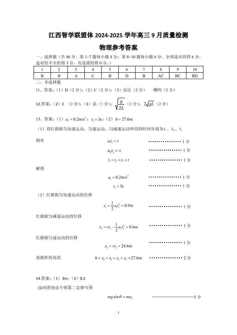 江西智学联盟体2024-2025学年高三9月质量检测+物理答案
