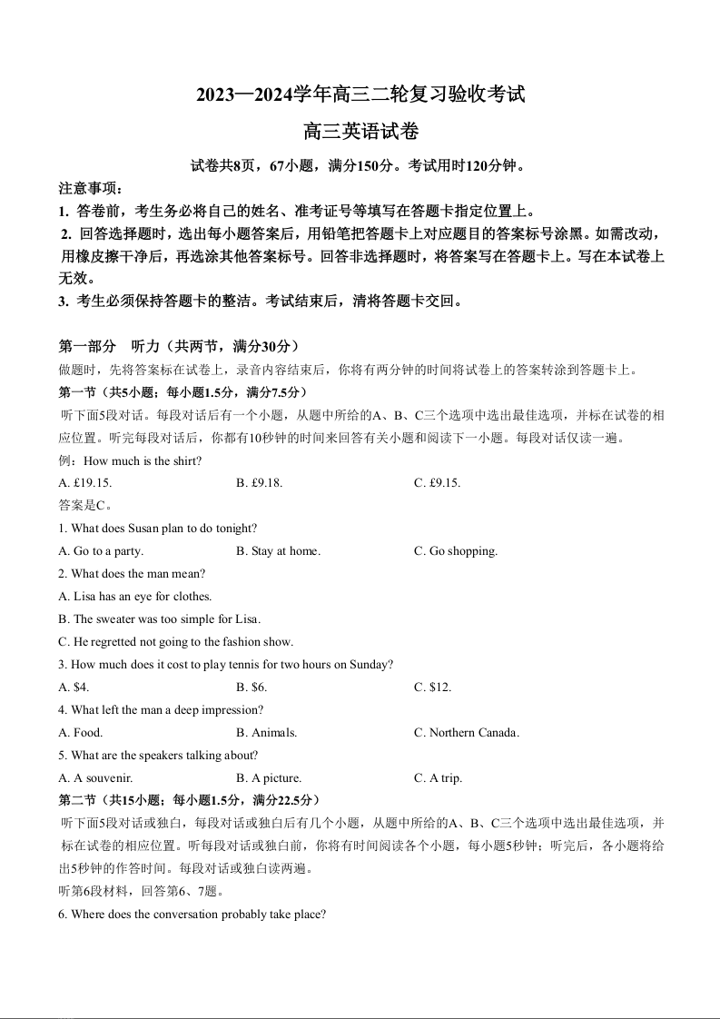 江西稳派2023-2024学年高三二轮复习验收考试+英语