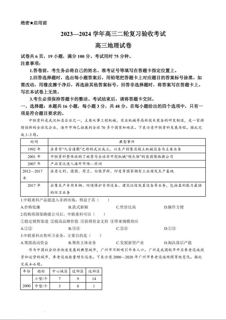 江西稳派2023-2024学年高三二轮复习验收考试+地理