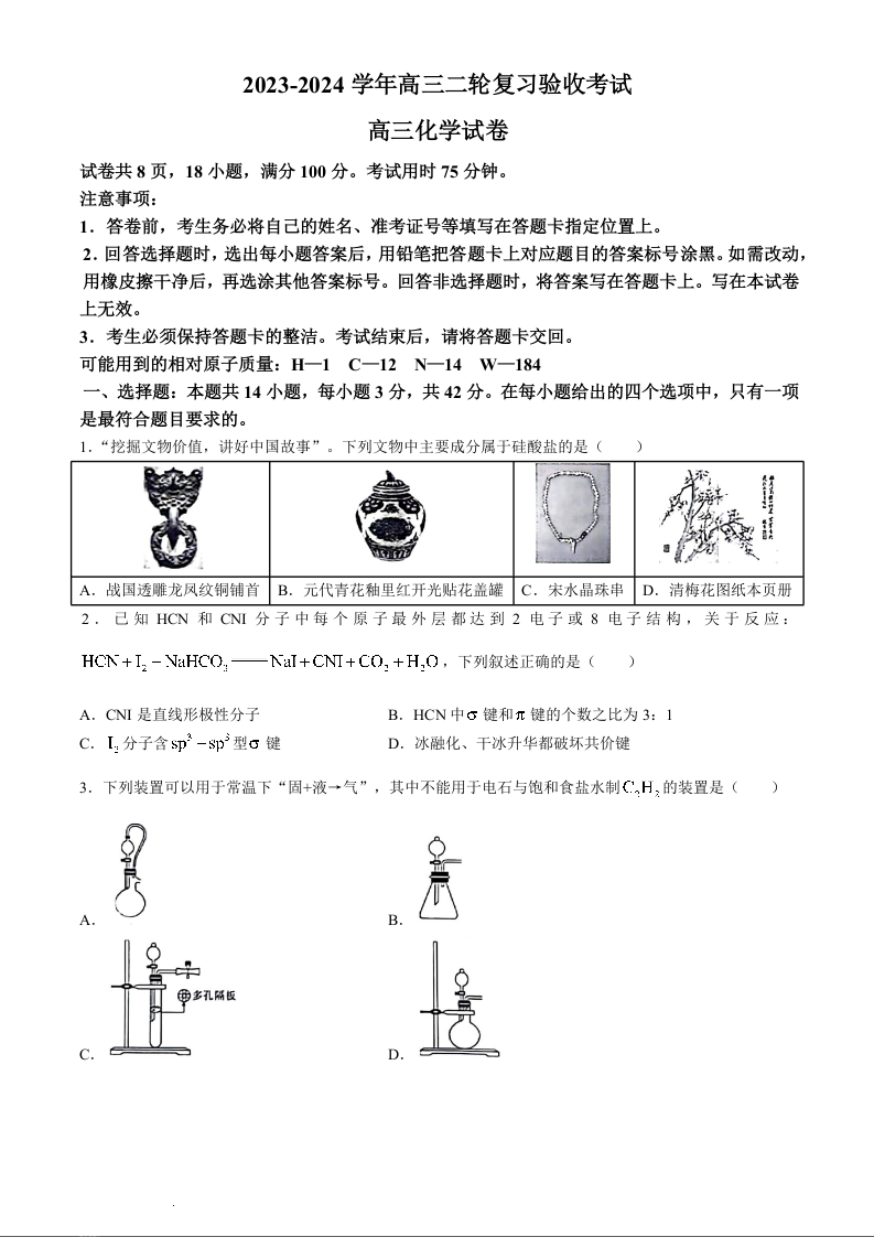 江西稳派2023-2024学年高三二轮复习验收考试+化学