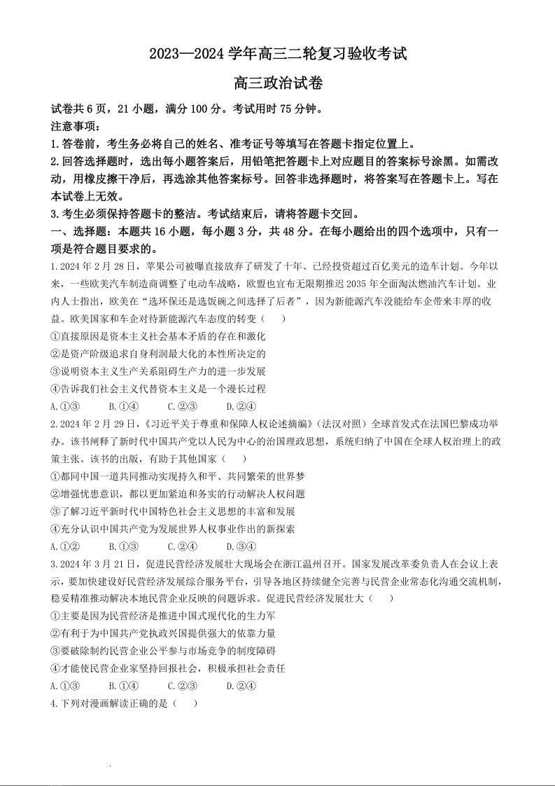 江西稳派2023-2024学年高三二轮复习验收考试+政治