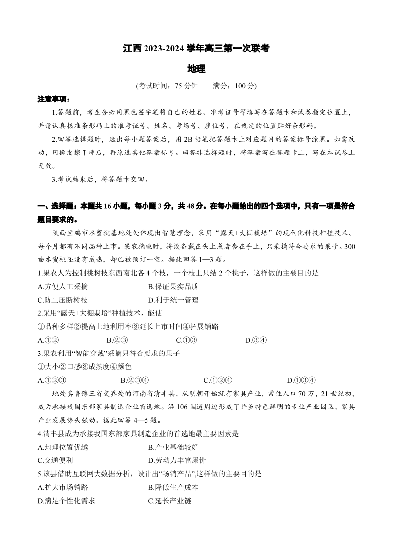 江西智学联盟体2023-2024学年高三第一次联考 地理