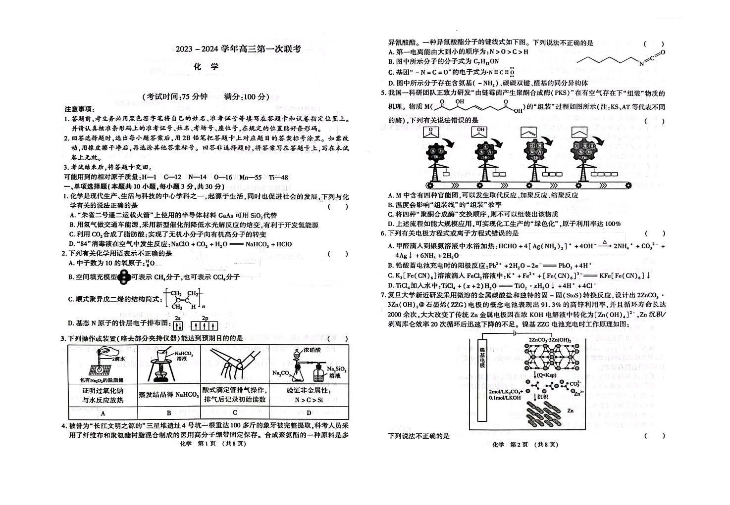 江西智学联盟体2023-2024学年高三第一次联考 化学