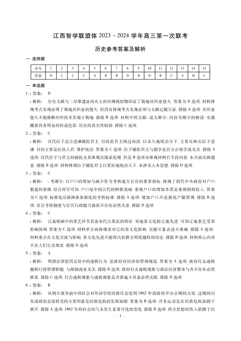 江西智学联盟体2023-2024学年高三第一次联考 历史答案
