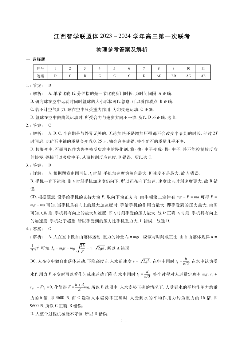 江西智学联盟体2023-2024学年高三第一次联考 物理答案