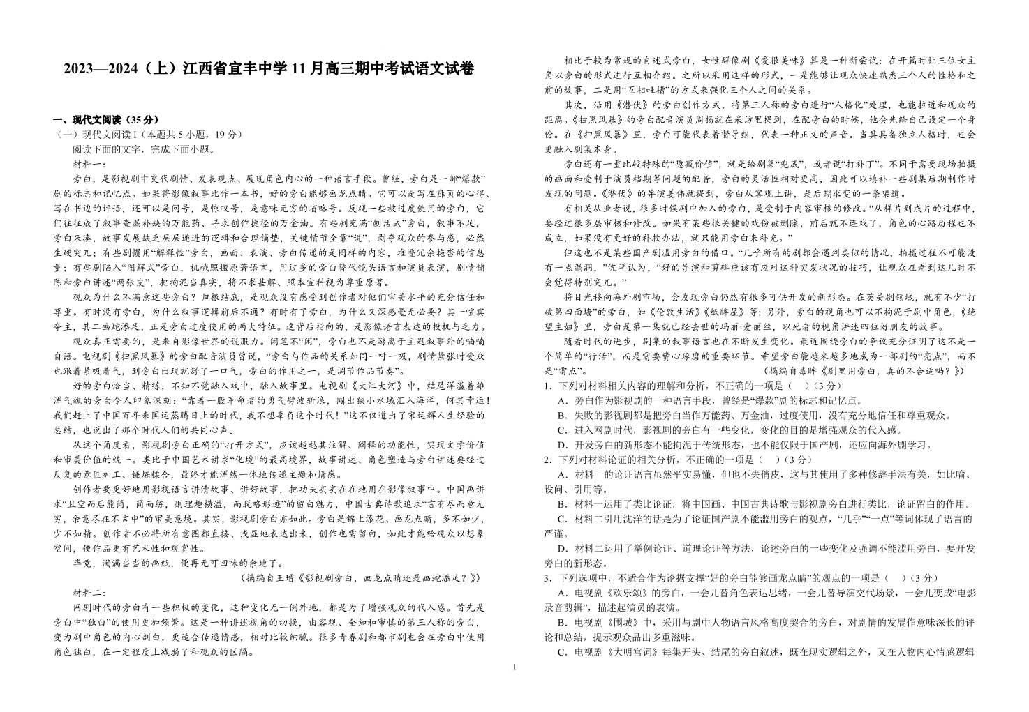 江西省宜丰中学2023-2024学年高三上学期11月期中考试 语文