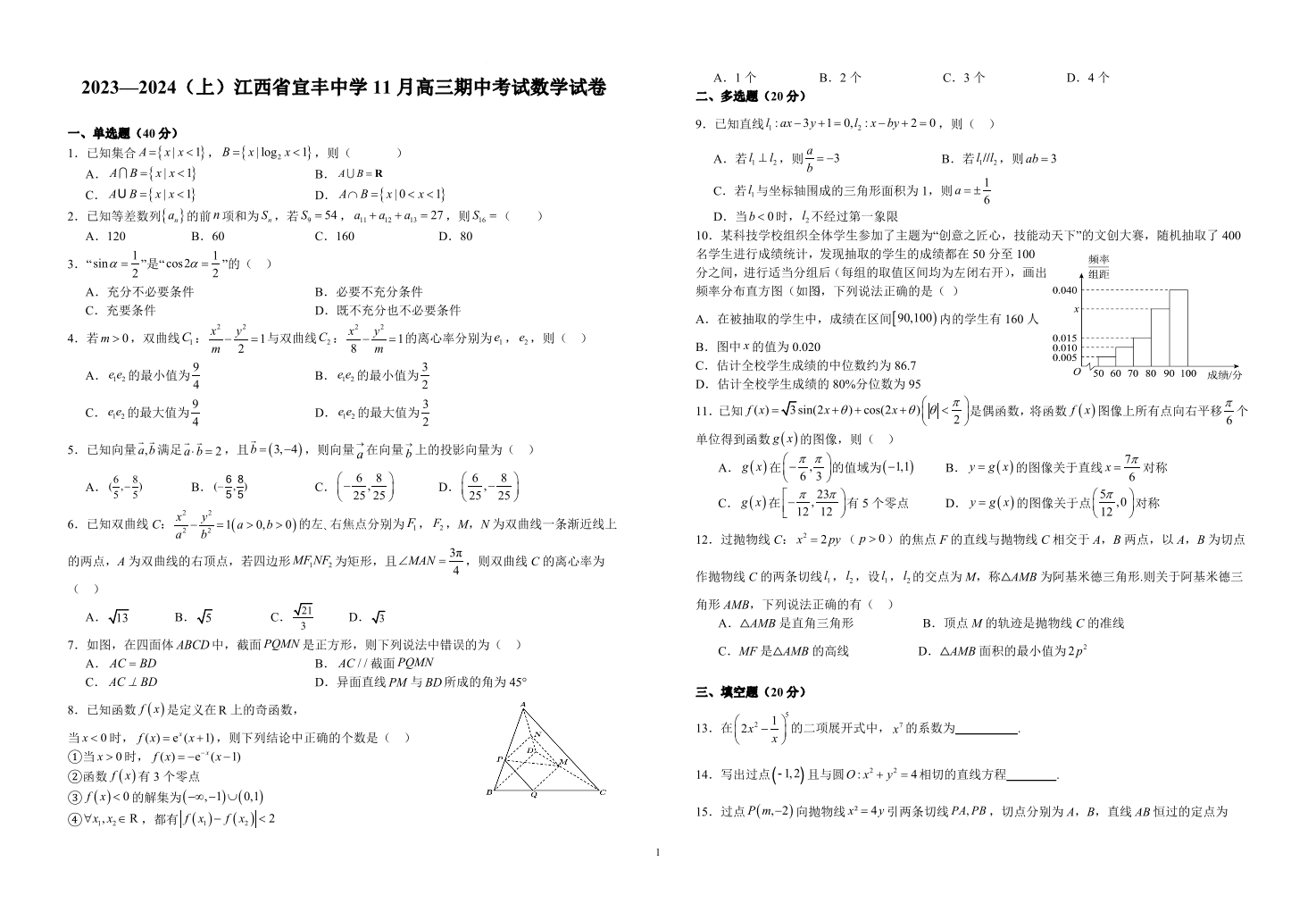 江西省宜丰中学2023-2024学年高三上学期11月期中考试 数学