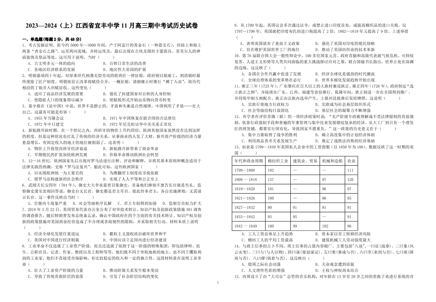 江西省宜丰中学2023-2024学年高三上学期11月期中考试 历史