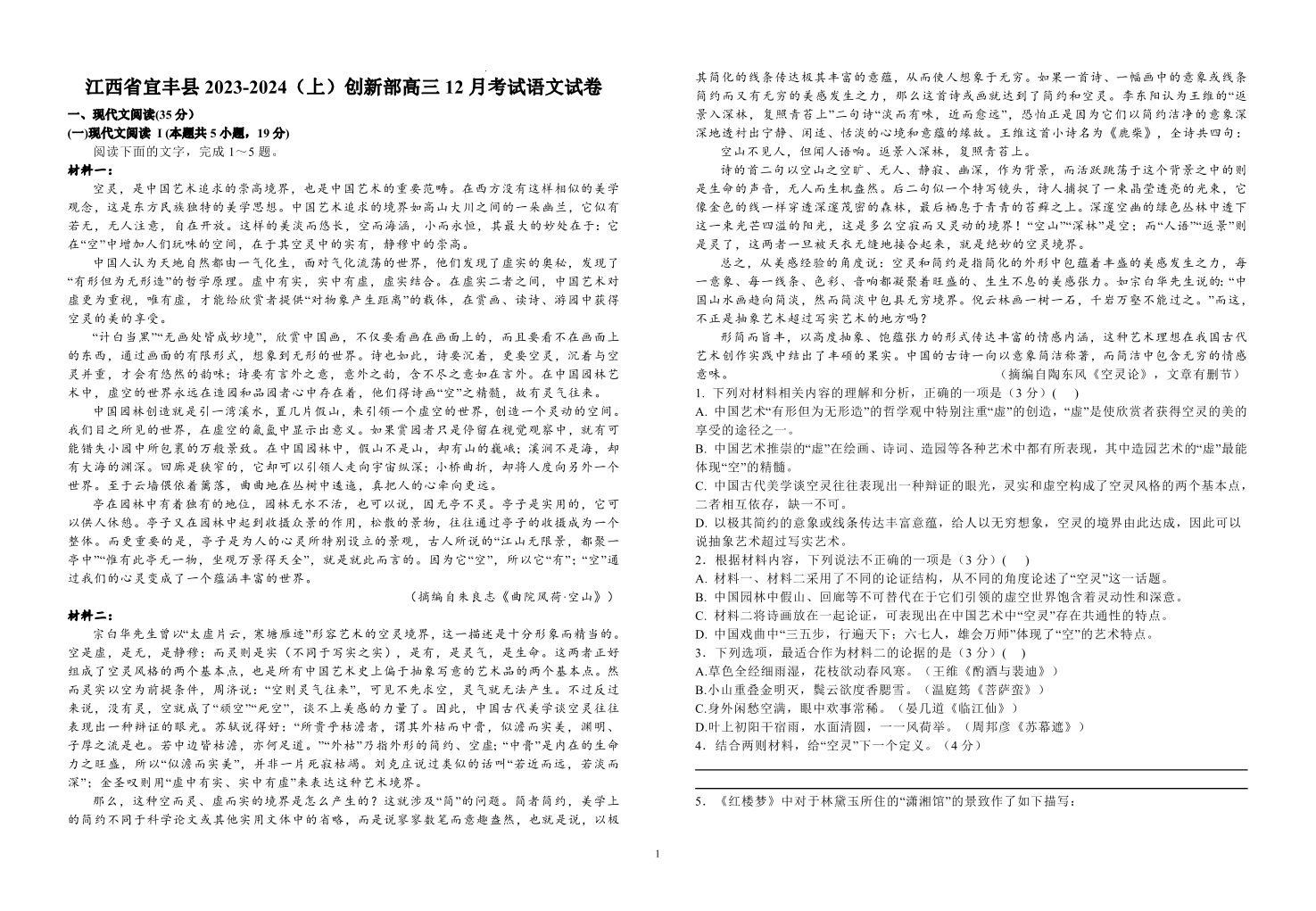 江西省宜春市宜丰中学2024届高三上学期12月月考 语文