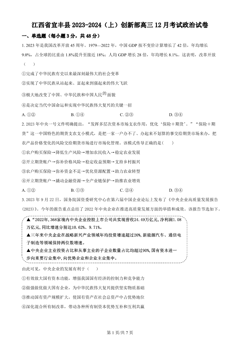江西省宜春市宜丰中学2024届高三上学期12月月考 政治