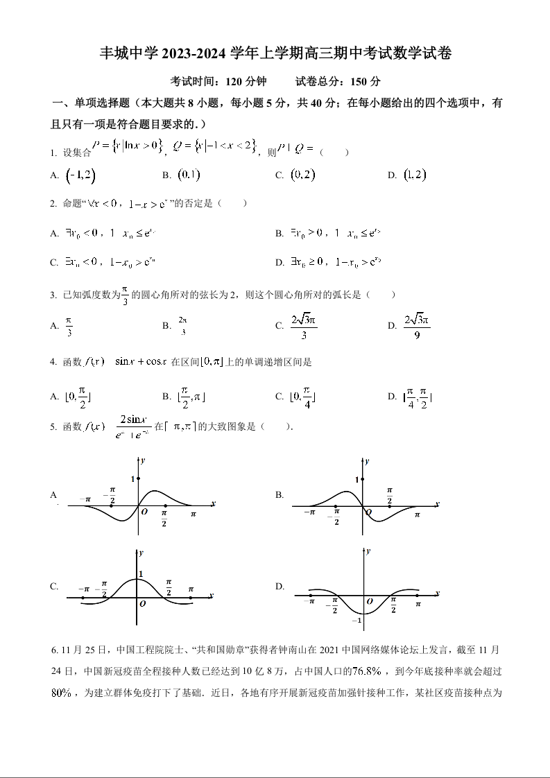 江西省宜春市丰城中学2023-2024学年高三上学期期中考试 数学