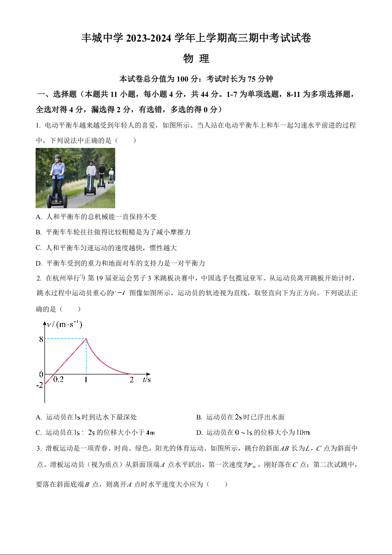江西省宜春市丰城中学2023-2024学年高三上学期期中考试 物理