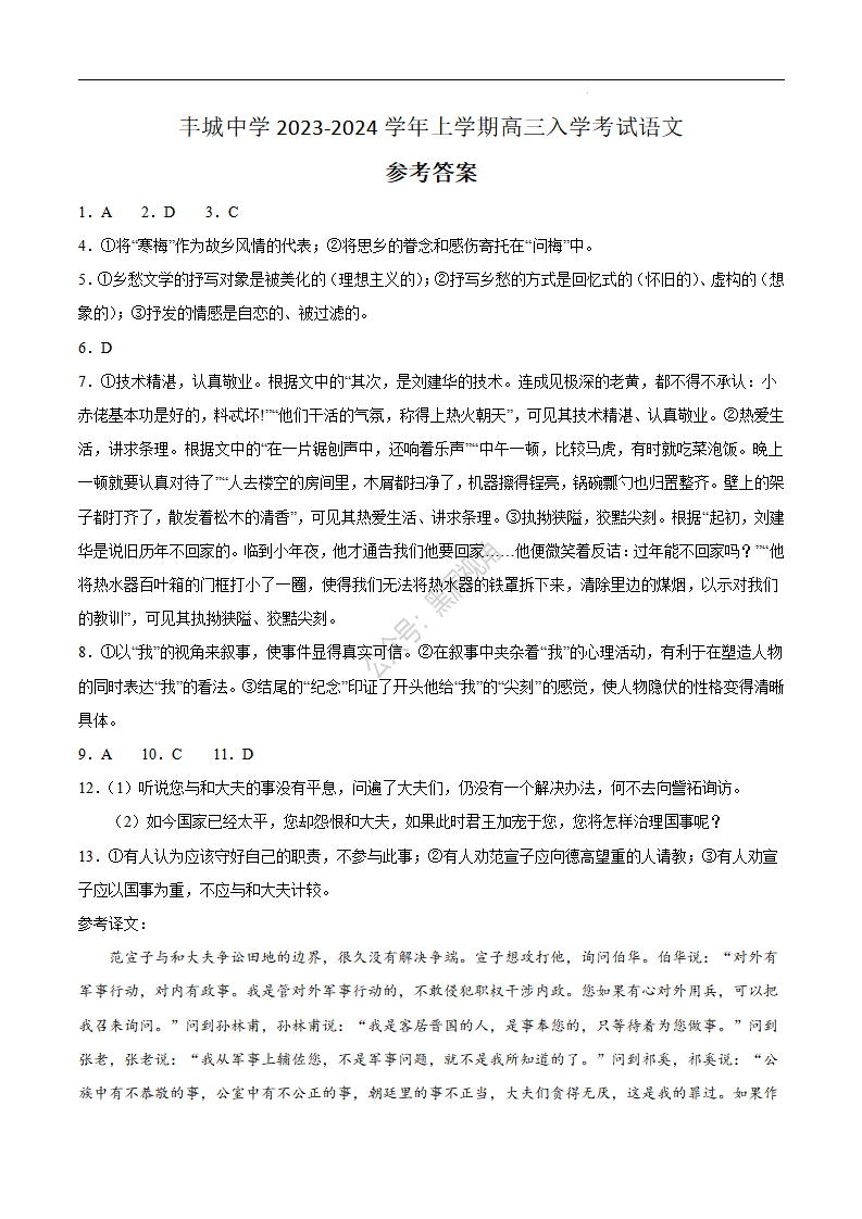 江西省丰城中学2023-2024学年高三上学期开学考试 语文答案