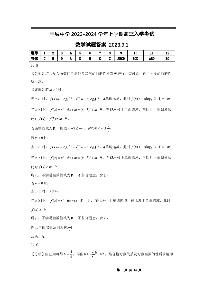 江西省丰城中学2023-2024学年高三上学期开学考试 数学答案