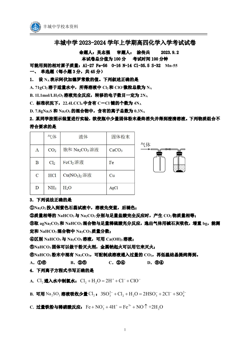 江西省丰城中学2023-2024学年高三上学期开学考试 化学