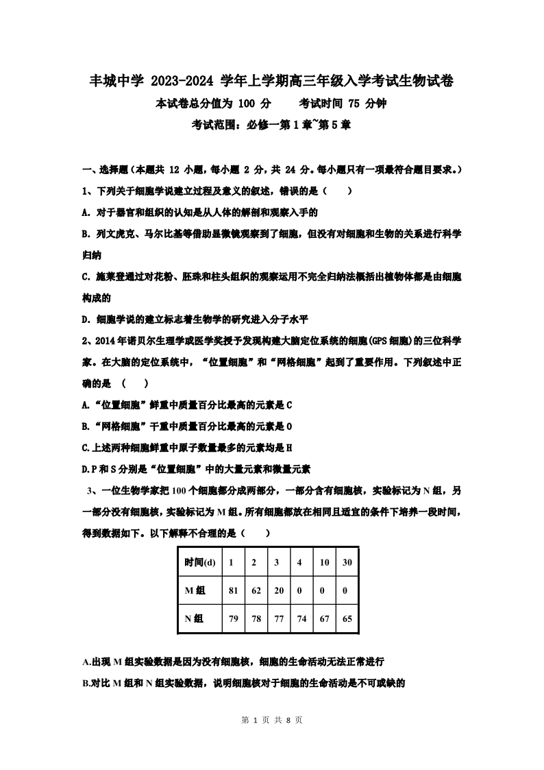 江西省丰城中学2023-2024学年高三上学期开学考试 生物