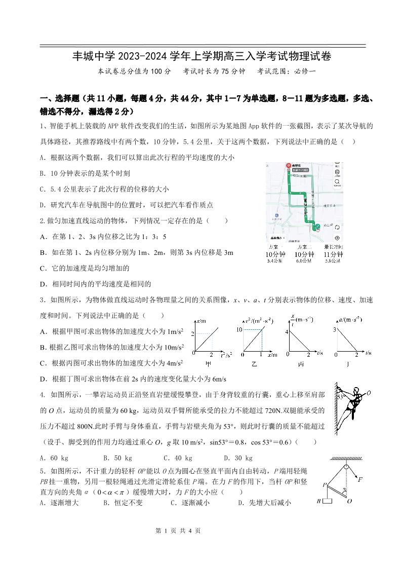 江西省丰城中学2023-2024学年高三上学期开学考试 物理