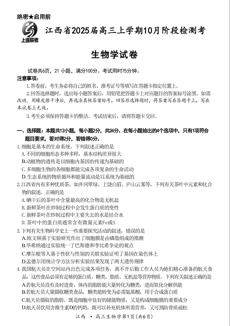 江西省稳派智慧上进联考2025届高三10月联考+生物