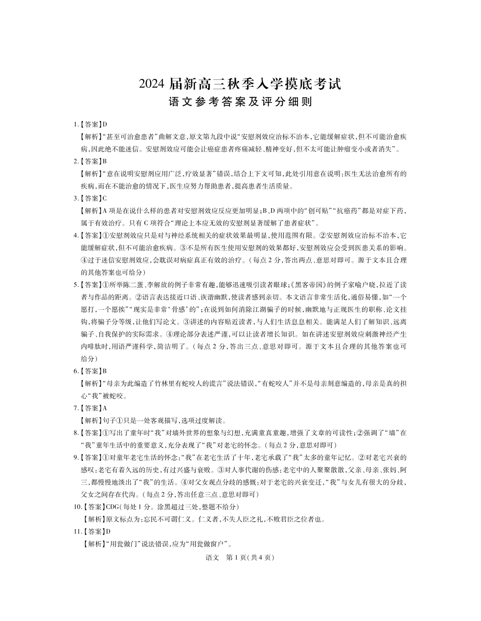 江西省稳派上进教育2024届高三上学期8月入学摸底考试 语文答案