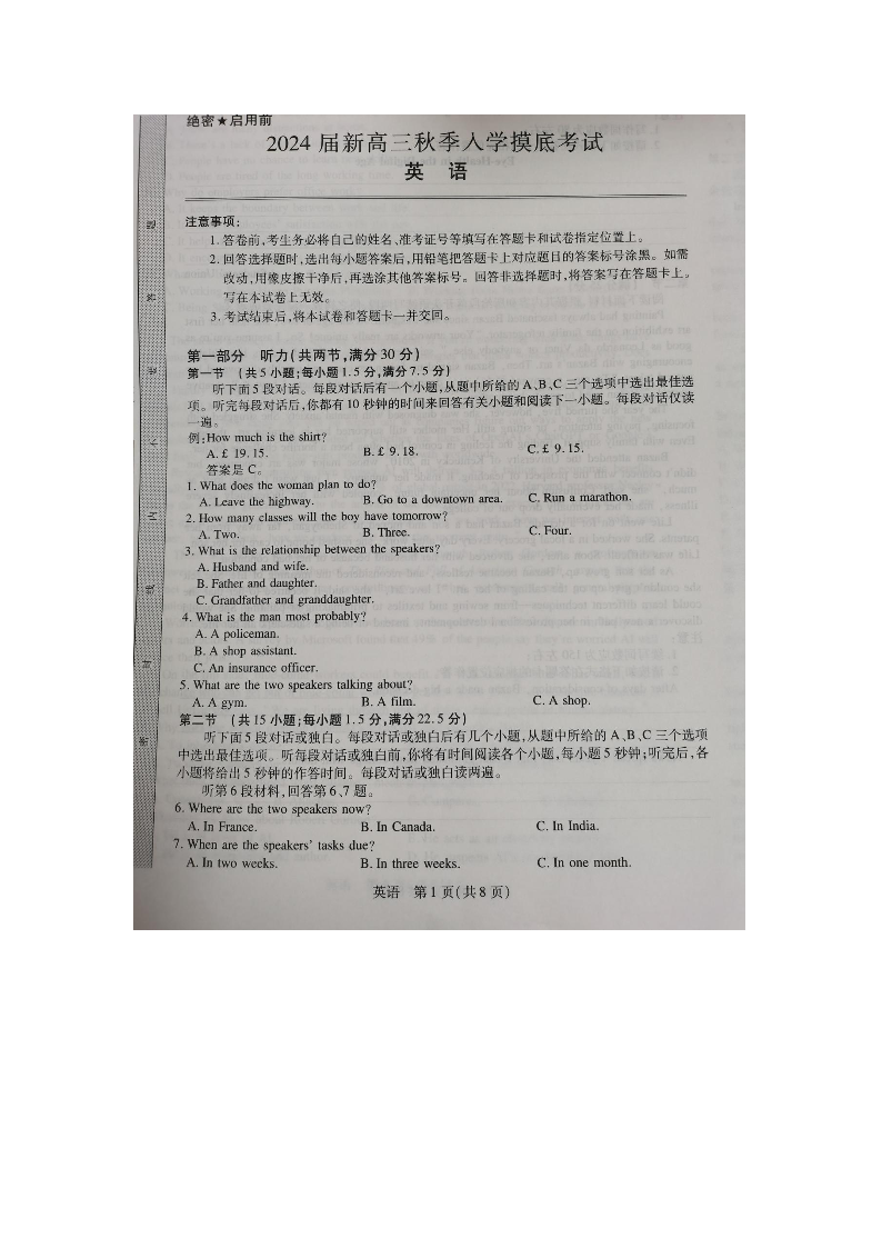 江西省稳派上进教育2024届高三上学期8月入学摸底考试 英语