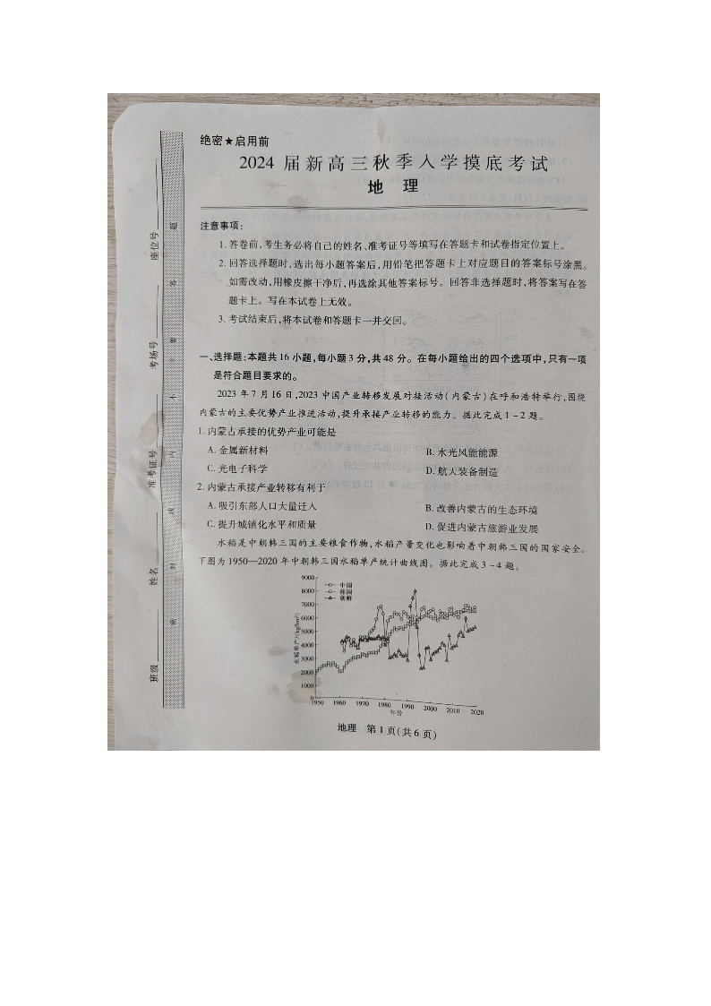 江西省稳派上进教育2024届高三上学期8月入学摸底考试 地理