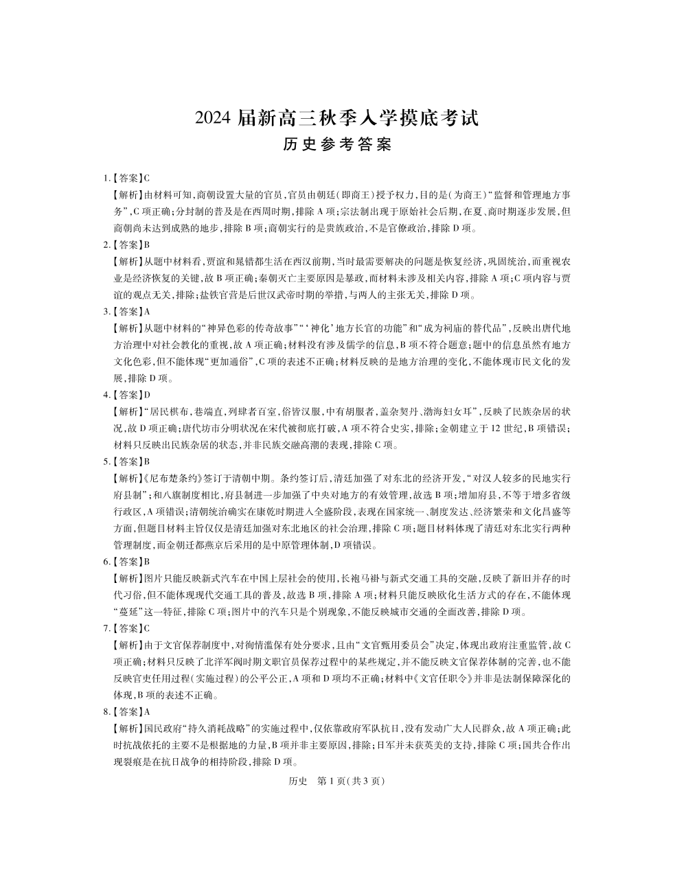 江西省稳派上进教育2024届高三上学期8月入学摸底考试 历史答案