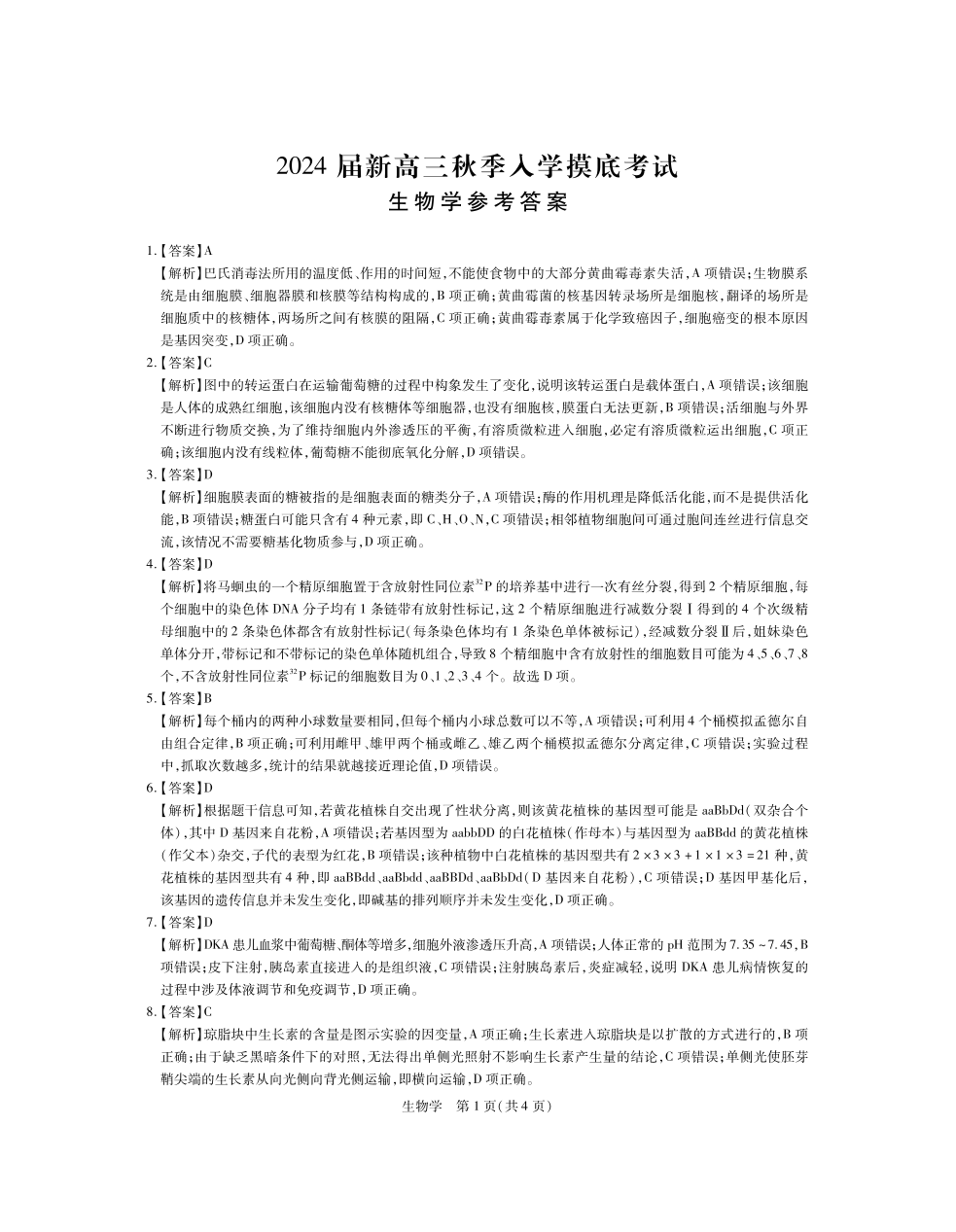 江西省稳派上进教育2024届高三上学期8月入学摸底考试 生物答案