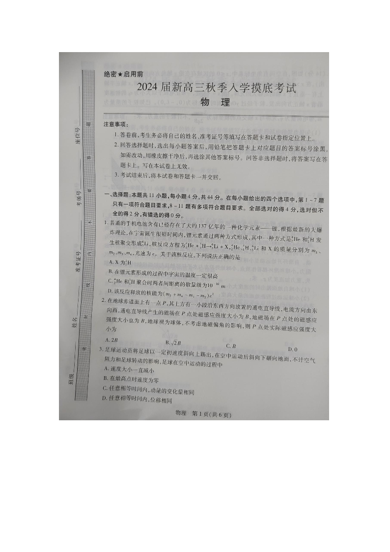 江西省稳派上进教育2024届高三上学期8月入学摸底考试 物理
