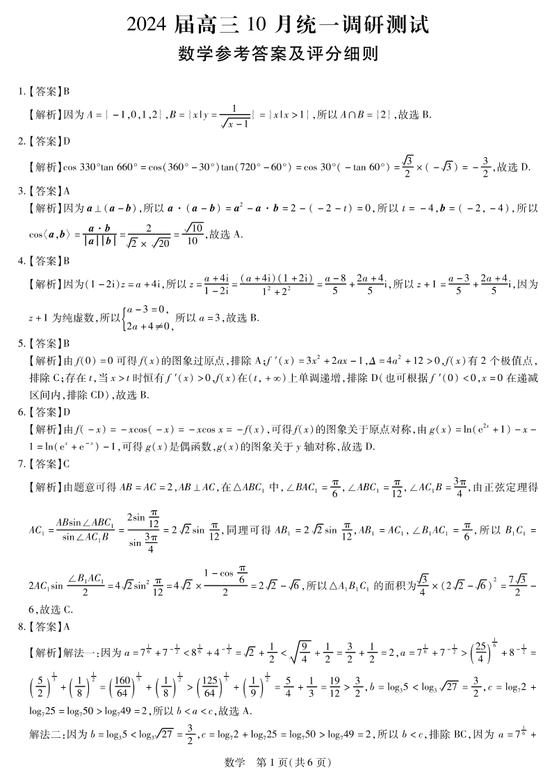 江西省稳派联考2023-2024学年高三上学期10月统一调研测试 数学答案