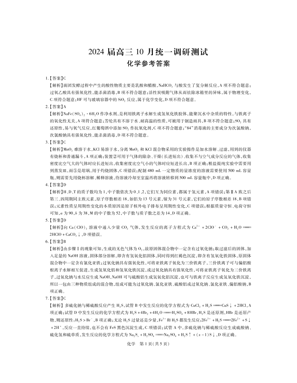 江西省稳派联考2023-2024学年高三上学期10月统一调研测试 化学答案