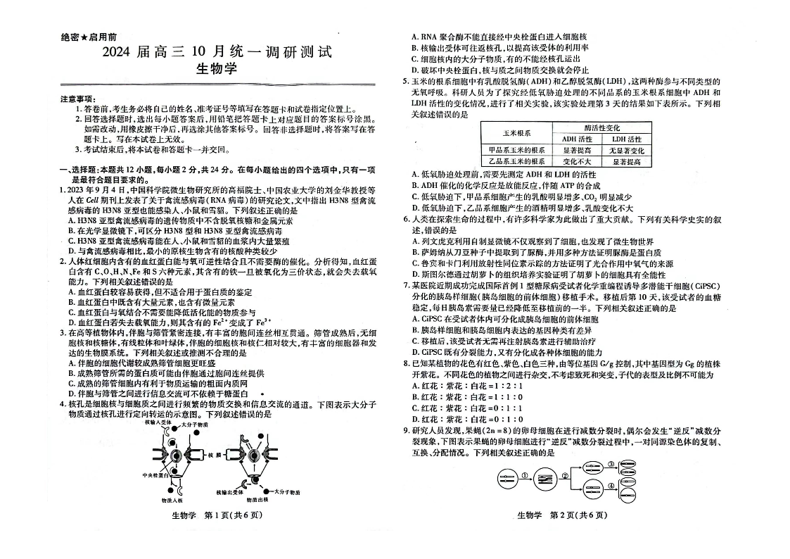 江西省稳派联考2023-2024学年高三上学期10月统一调研测试 生物