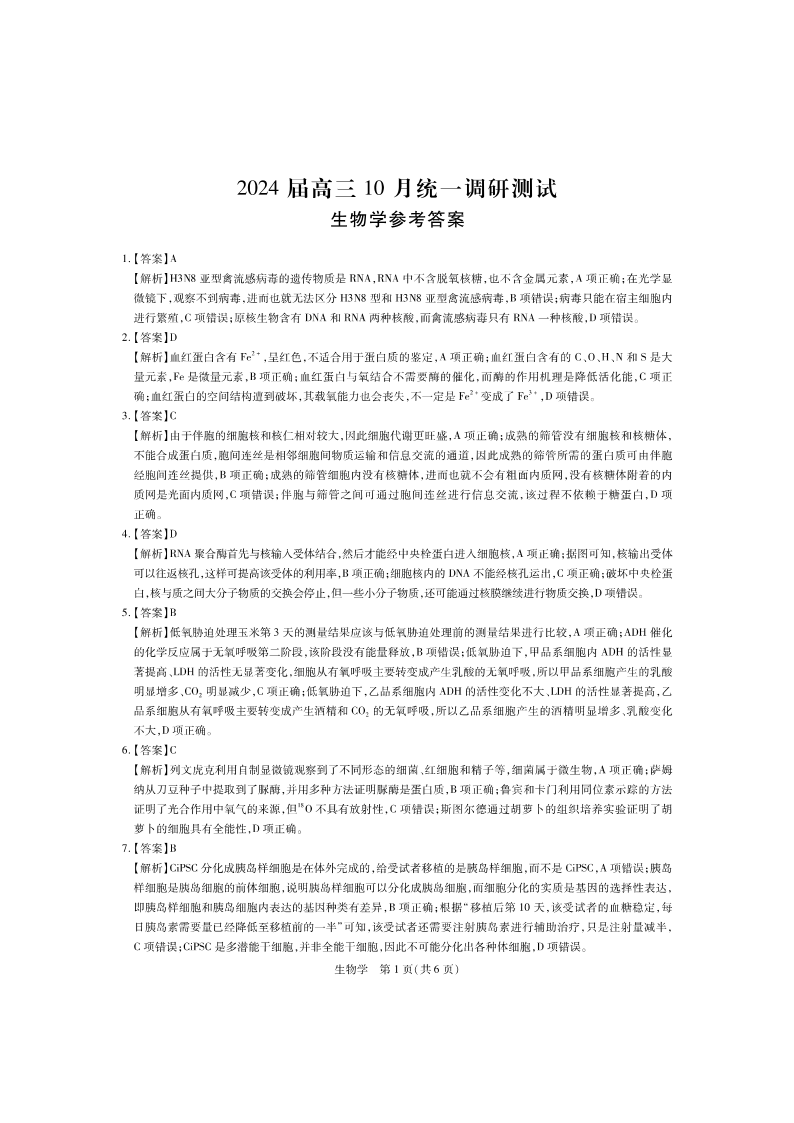 江西省稳派联考2023-2024学年高三上学期10月统一调研测试 生物答案