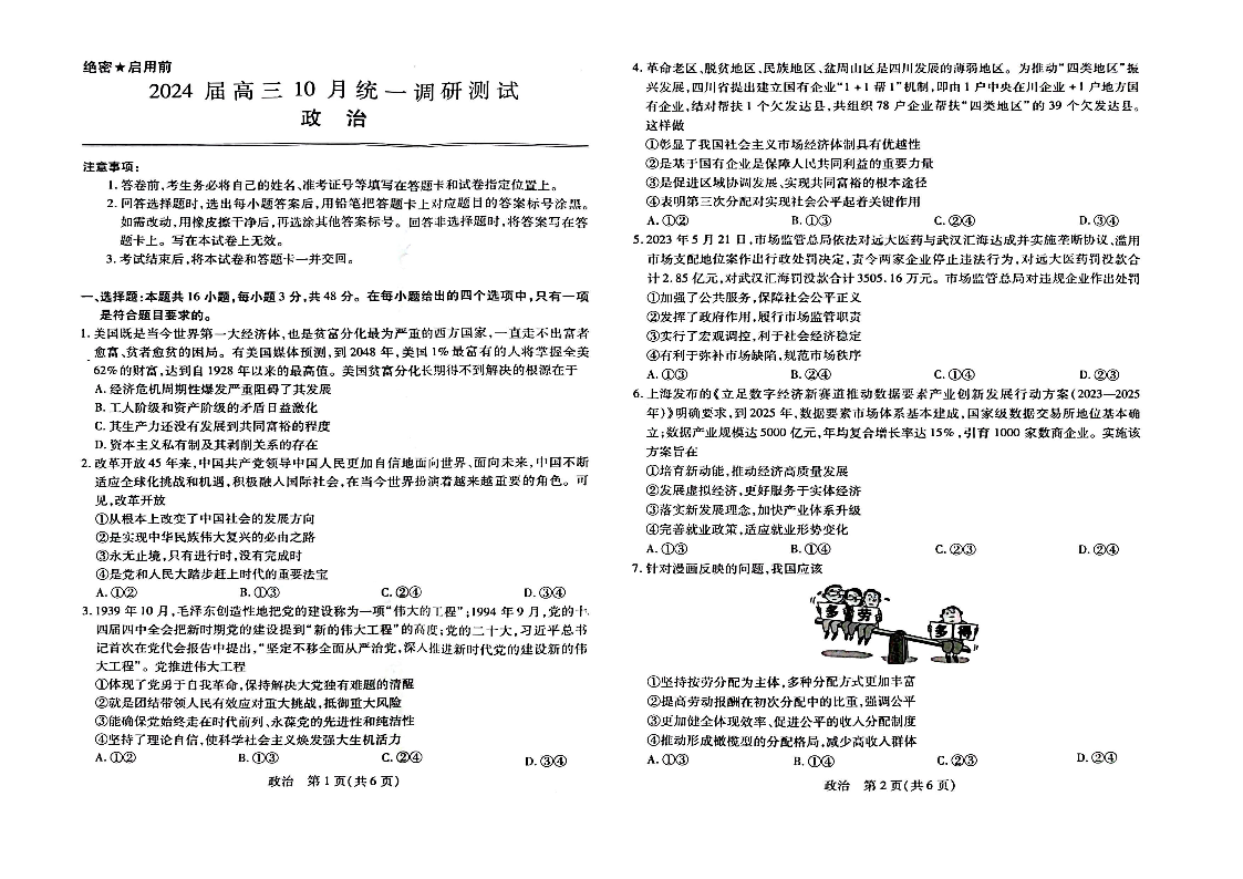 江西省稳派联考2023-2024学年高三上学期10月统一调研测试 政治