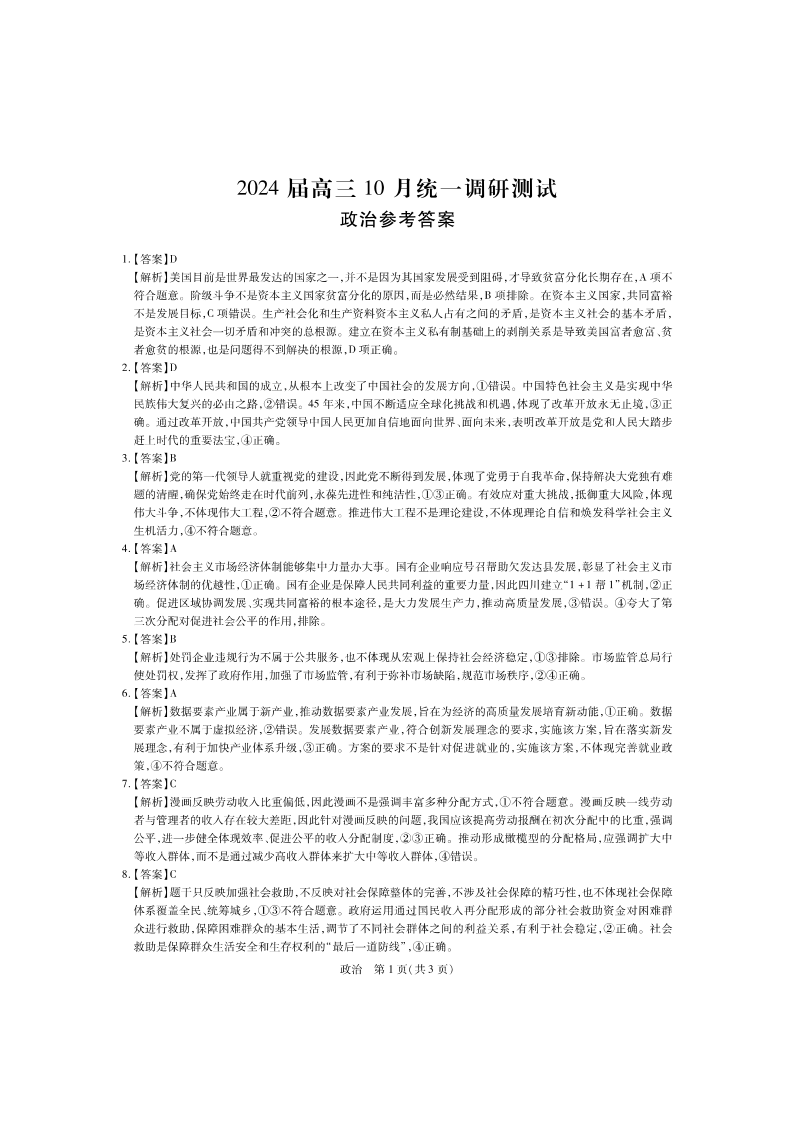 江西省稳派联考2023-2024学年高三上学期10月统一调研测试 政治答案