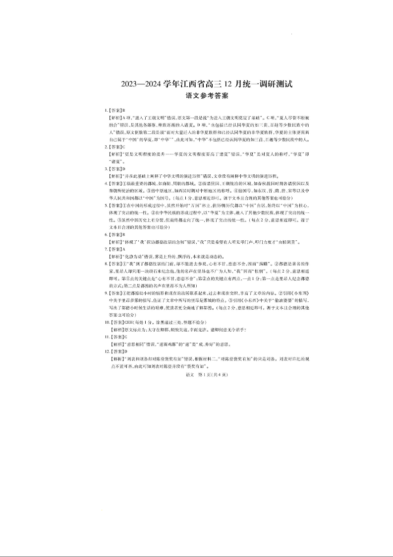 江西省2023-2024学年高三上学期12月统一调研测试 语文答案