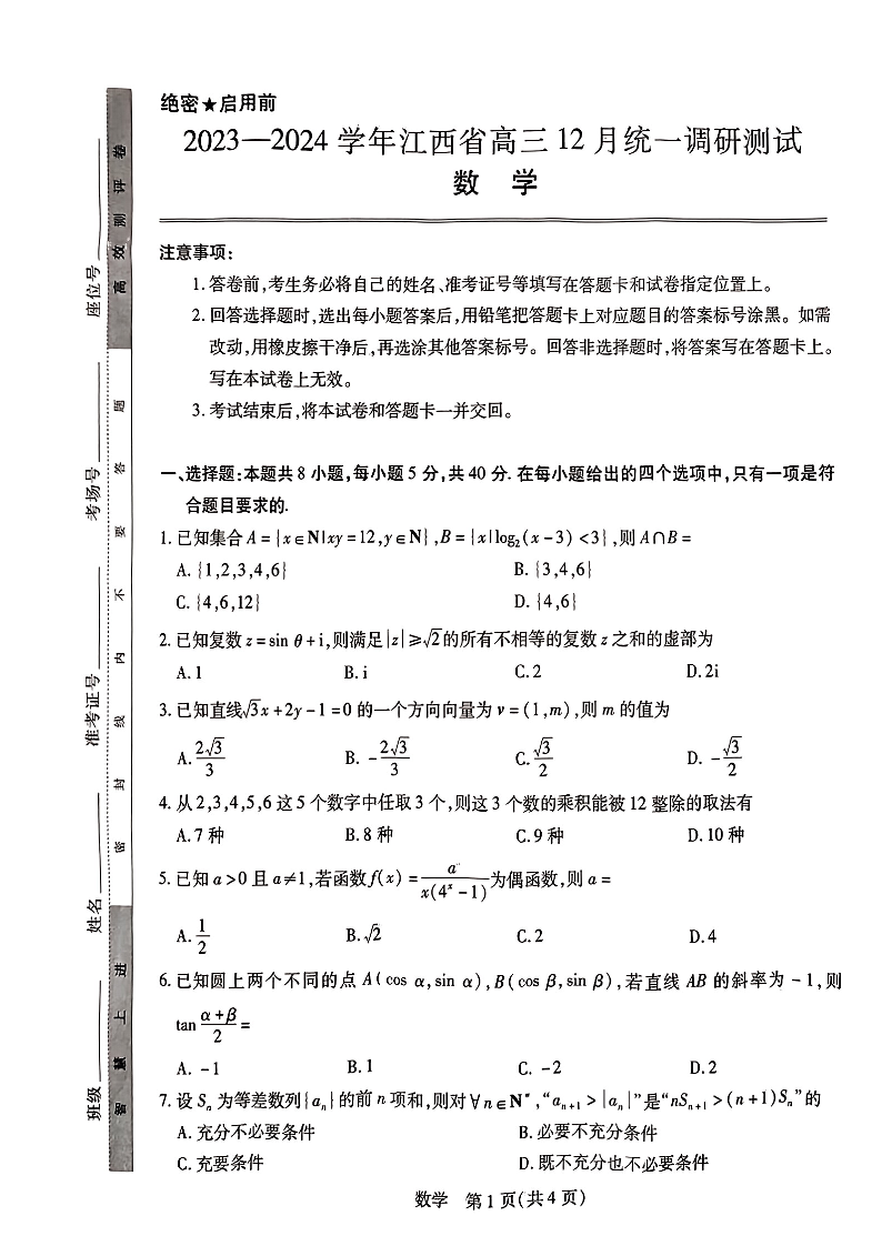 江西省2023-2024学年高三上学期12月统一调研测试 数学
