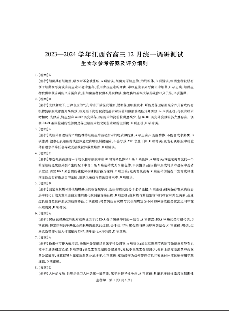 江西省2023-2024学年高三上学期12月统一调研测试 生物答案