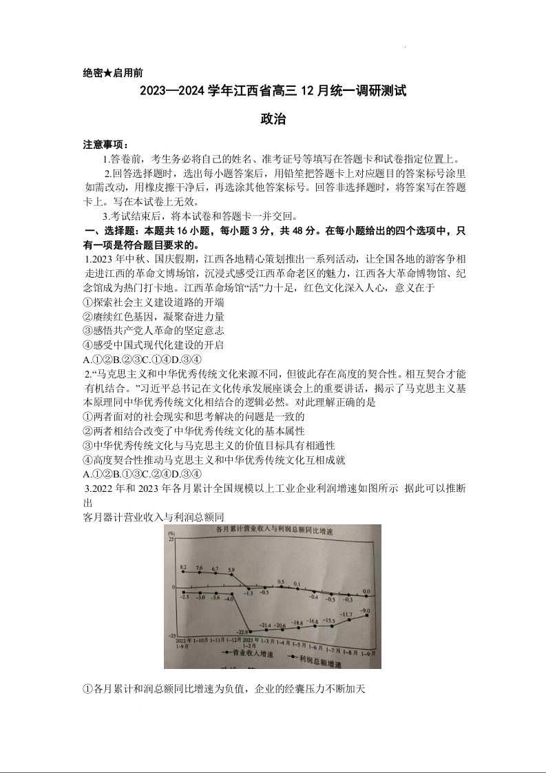 江西省2023-2024学年高三上学期12月统一调研测试 政治