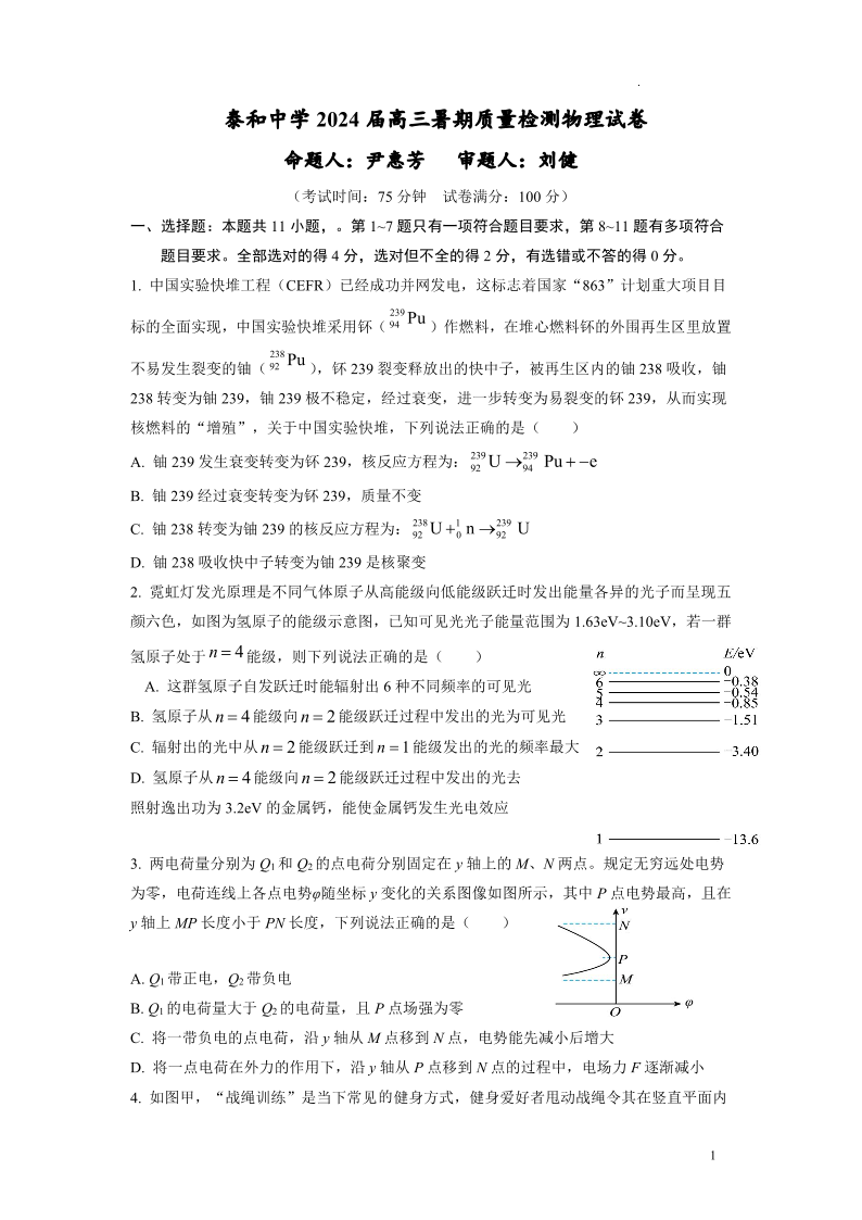江西省泰和中学2024届高三暑期质量检测 物理