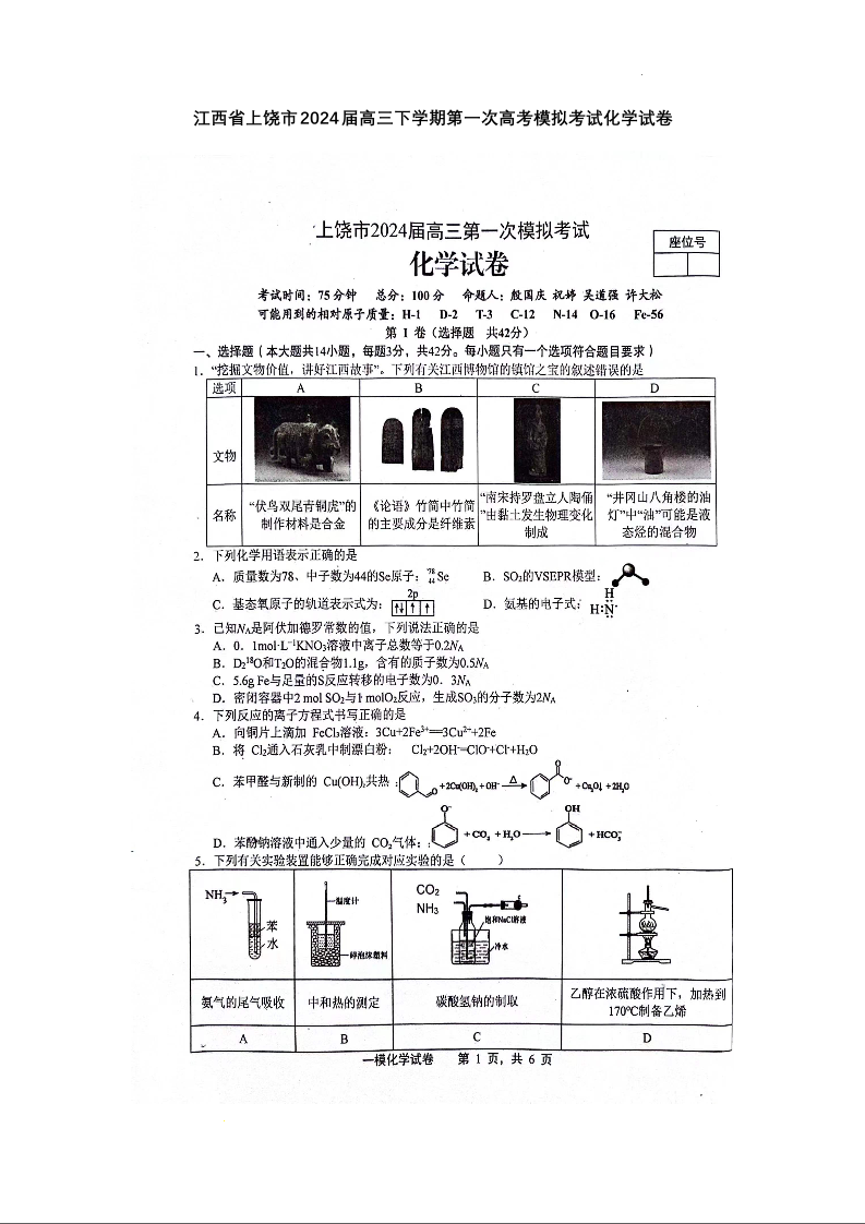 江西省上饶市2024届高三下学期第一次高考模拟考试 化学