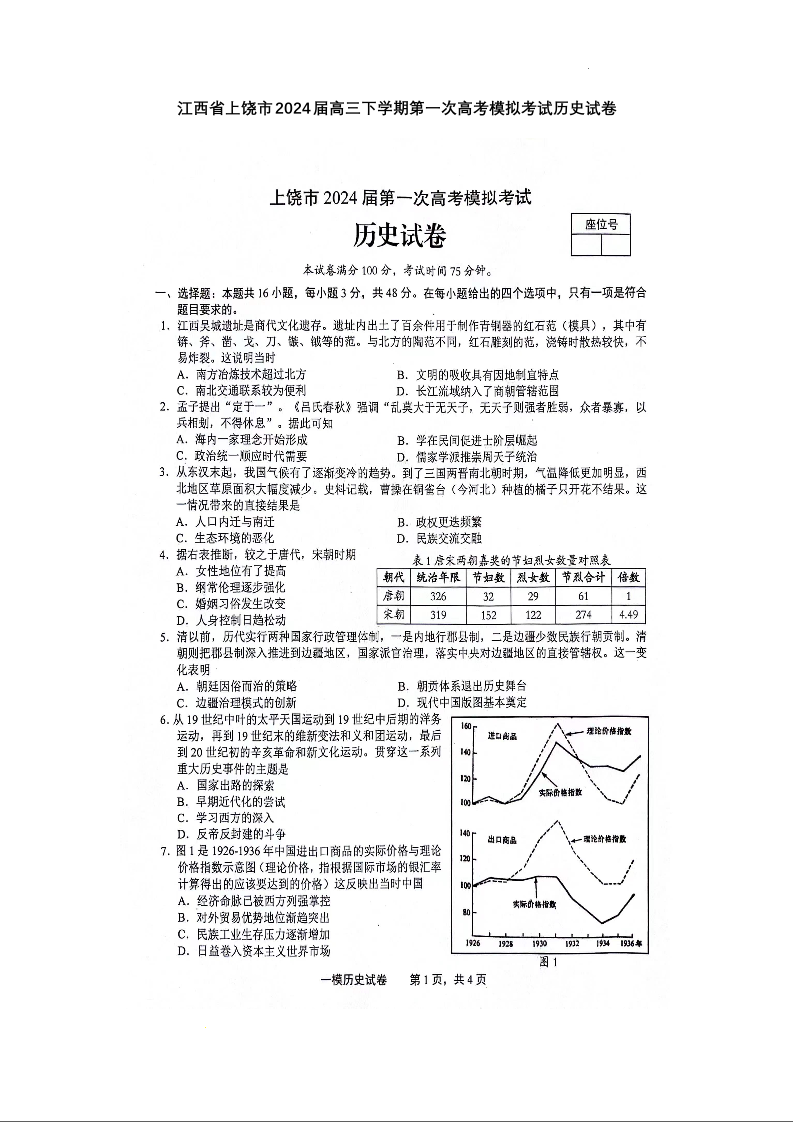 江西省上饶市2024届高三下学期第一次高考模拟考试 历史