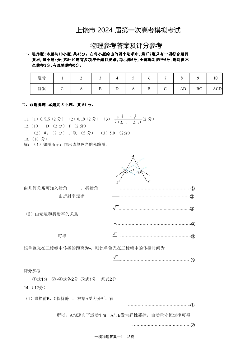 江西省上饶市2024届高三下学期第一次高考模拟考试 物理答案