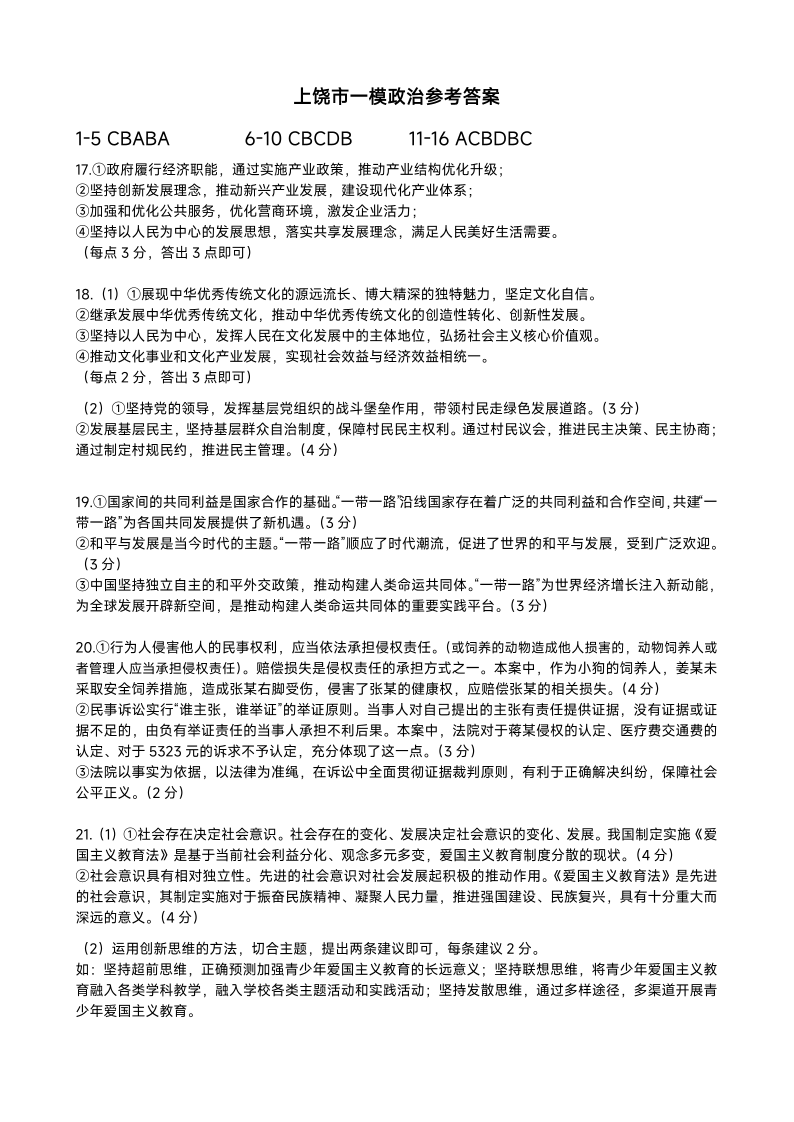 江西省上饶市2024届高三下学期第一次高考模拟考试 政治答案